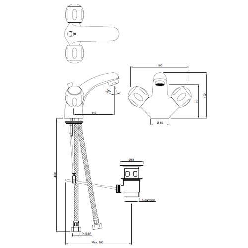 Central Hole Basin Mixer with Popup Waste System with 450mm Long Braided Hoses
